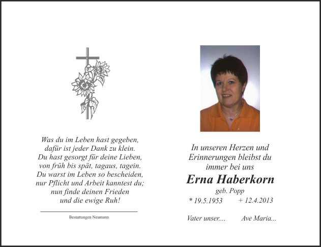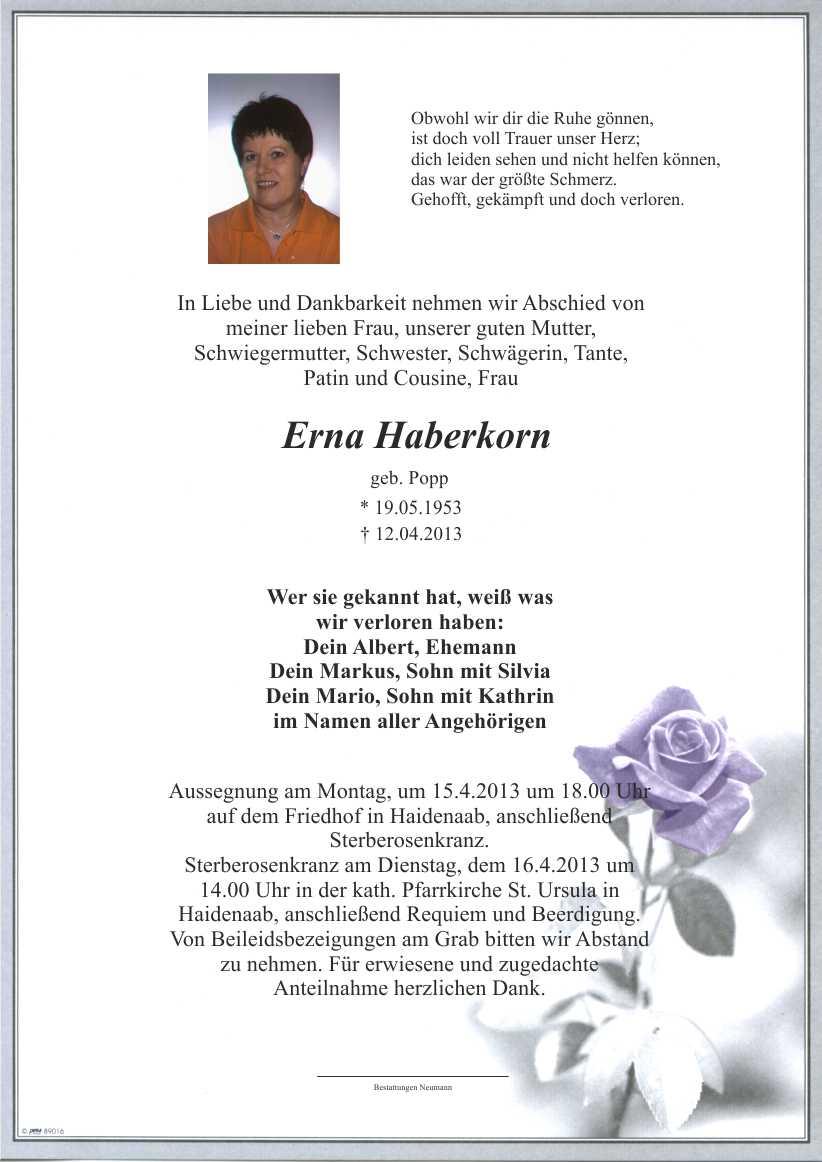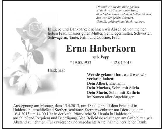 Aussegnung am Montag, dem 15.4.2013, um 18.00 Uhr auf dem Friedhof in Haidenaab, anschließend Sterberosenkranz. Sterberosenkranz am Dienstag, dem 16.4.2013 um 14.00 Uhr in der kath. Pfarrkirche St. Ursula in Haidenaab, anschließend Requiem und Beerdigung. Von Beileidsbezeigungen am Grab bitten wir Abstand zu nehmen. Für erwiesene und zugedachte Anteilnahme herzlichen Dank.