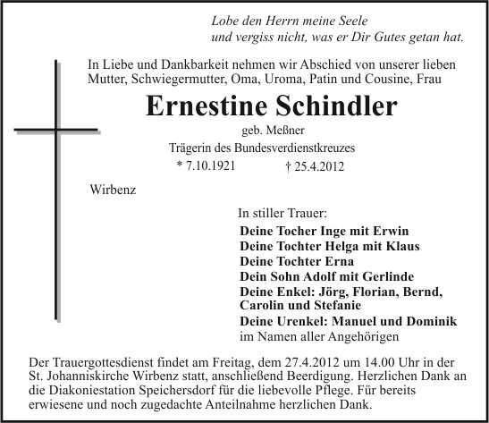 Der Trauergottesdienst findet am Freitag, dem 27.4.2012 um 14.00 Uhr in der St. Johanniskirche Wirbenz statt, anschließend Beerdigung. Herzlichen Dank an die Diakoniestation Speichersdorf für die liebevolle Pflege. Für bereits erwiesene und noch zugedachte Anteilnahme herzlichen Dank.