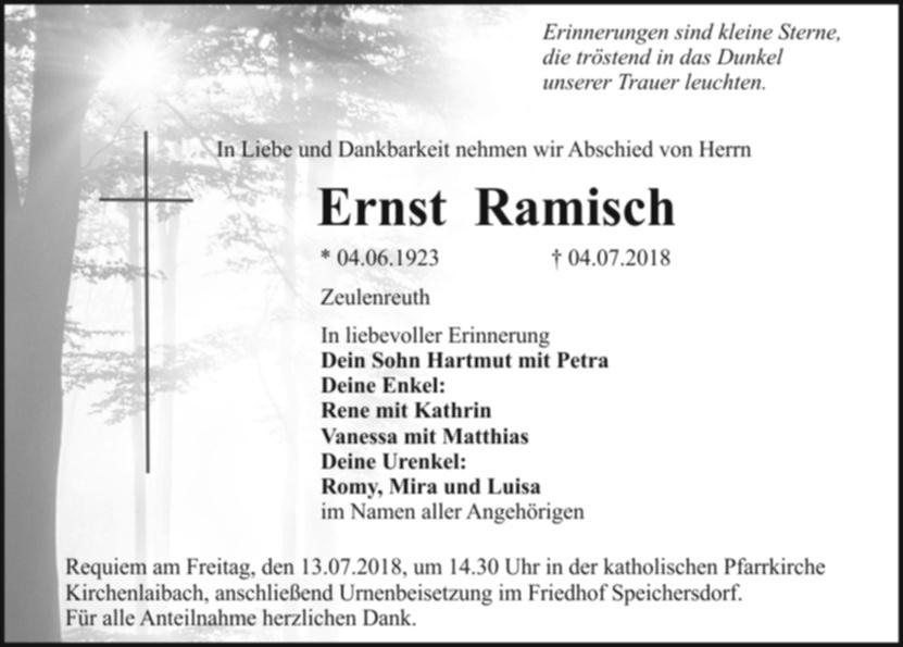 Requiem am Freitag, den 13.07.2018, um 14.30 Uhr in der katholischen Pfarrkirche Kirchenlaibach, anschließend Urnenbeisetzung im Friedhof Speichersdorf.