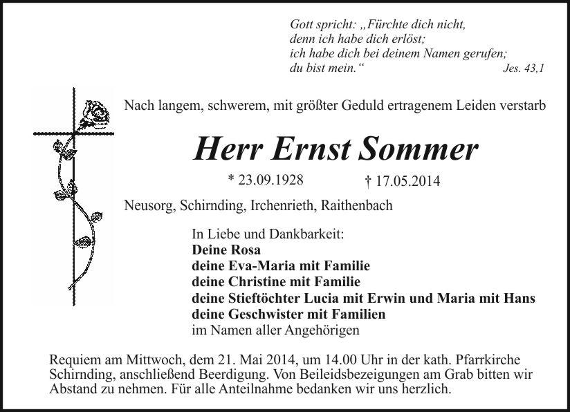 Requiem am Mittwoch, dem 21. Mai 2014, um 14.00 Uhr in der kath. Pfarrkirche Schirnding, anschließend Beerdigung. Von Beileidsbezeigungen am Grab bitten wir Abstand zu nehmen. Für alle Anteilnahme bedanken wir uns herzlich.