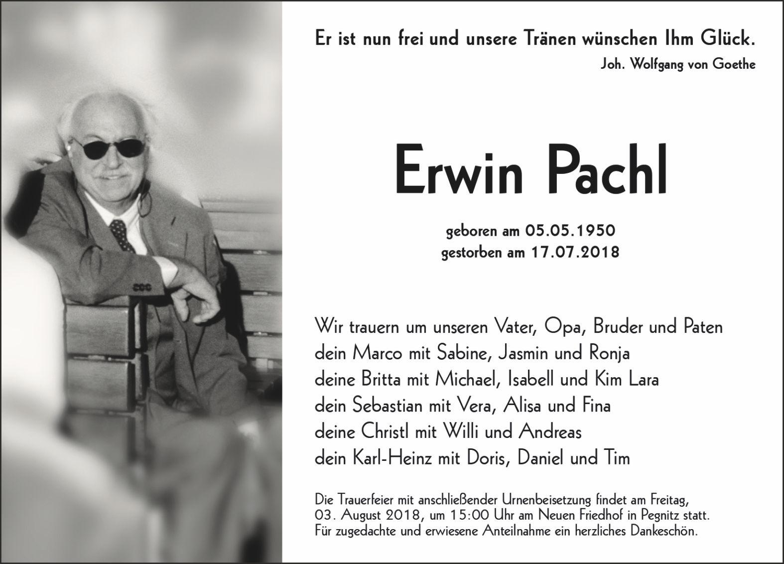 Die Trauerfeier mit anschließender Urnenbeisetzung findet am Freitag, den 03.08.2018, um 15.00 Uhr im neuen Friedhof Pegnitz statt. Für alle Anteilnahme herzlichen Dank.