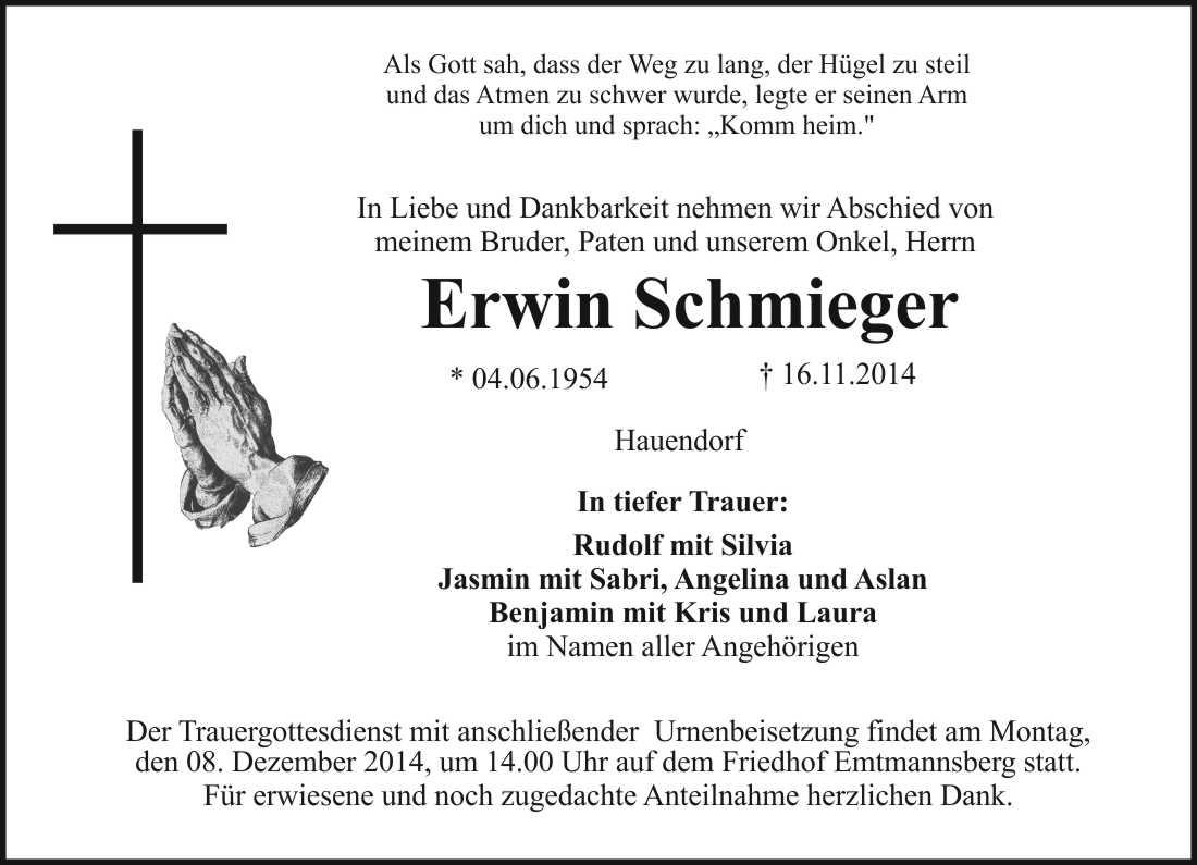 Der Trauergottesdienst mit anschließender Urnenbeisetzung findet am Montag, den 08. Dezember 2014, um 14.00 Uhr auf dem Friedhof Emtmannsberg statt.