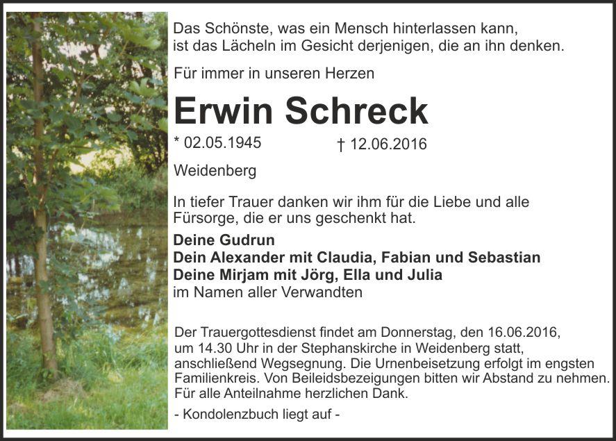 Der Trauergottesdienst findet am Donnerstag, den 16.06.2016, um 14.30 Uhr in der Stephanskirche in Weidenberg statt, anschließend Wegsegnung. Urnenbeisetzung im engsten Familienkreis. Von Beileidsbezeigungen bitten wir Abstand zu nehmen. Für alle Anteilnahme herzlichen Dank.