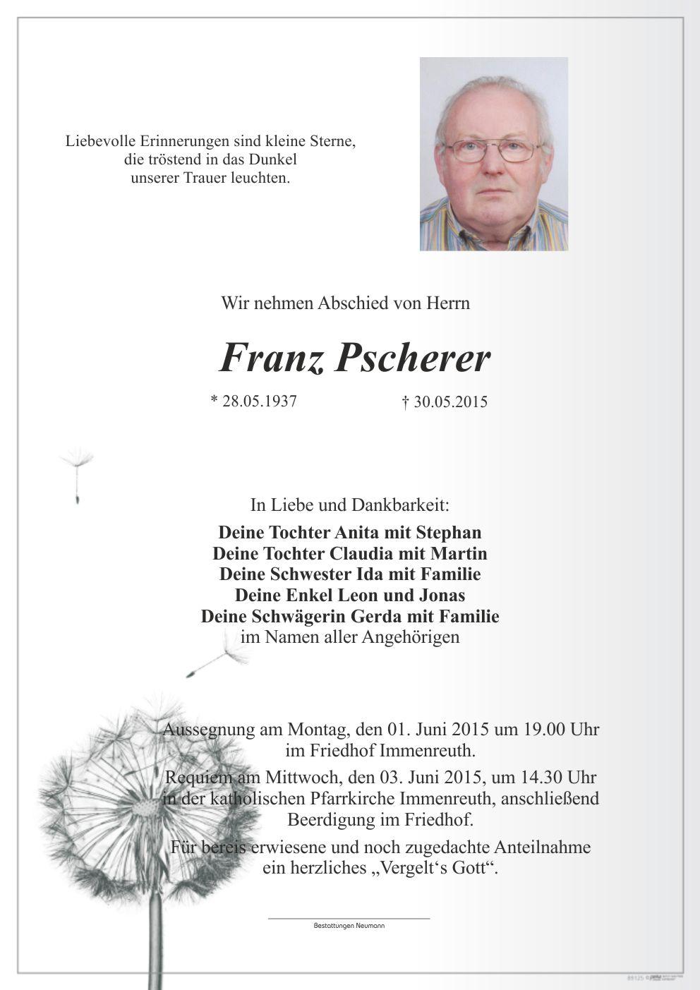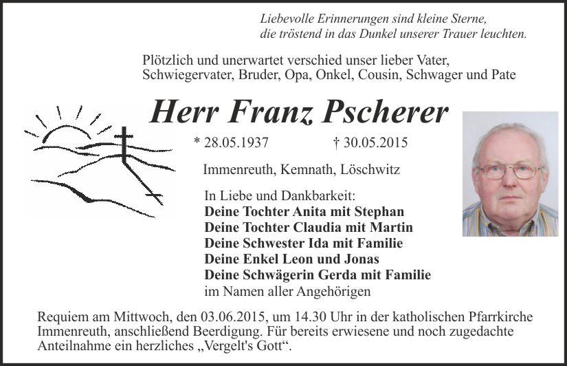 Requiem am Mittwoch, den 03. Juni 2015, um 14.30 Uhr in der katholischen Pfarrkirche Immenreuth, anschließend Beerdigung im Friedhof.