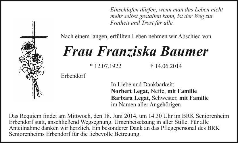 Das Requiem findet am Mittwoch, den 18. Juni 2014, um 14.30 Uhr im BRK Seniorenheim Erbendorf statt, anschließend Wegsegnung. Urnenbeisetzung in aller Stille. Für alle Anteilnahme danken wir herzlich. Ein besonderer Dank an das Pflegepersonal des BRK Seniorenheims Erbendorf für die liebevolle Betreuung.