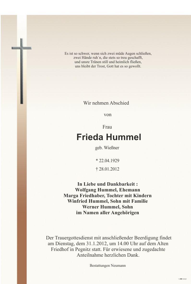 Der Trauergottesdienst mit anschließender Beerdigung findet am Dienstag, dem 31.1.2012, um 14.00 Uhr auf dem Alten Friedhof in Pegnitz statt. Für erwiesene und zugedachte Anteilnahme herzlichen Dank.