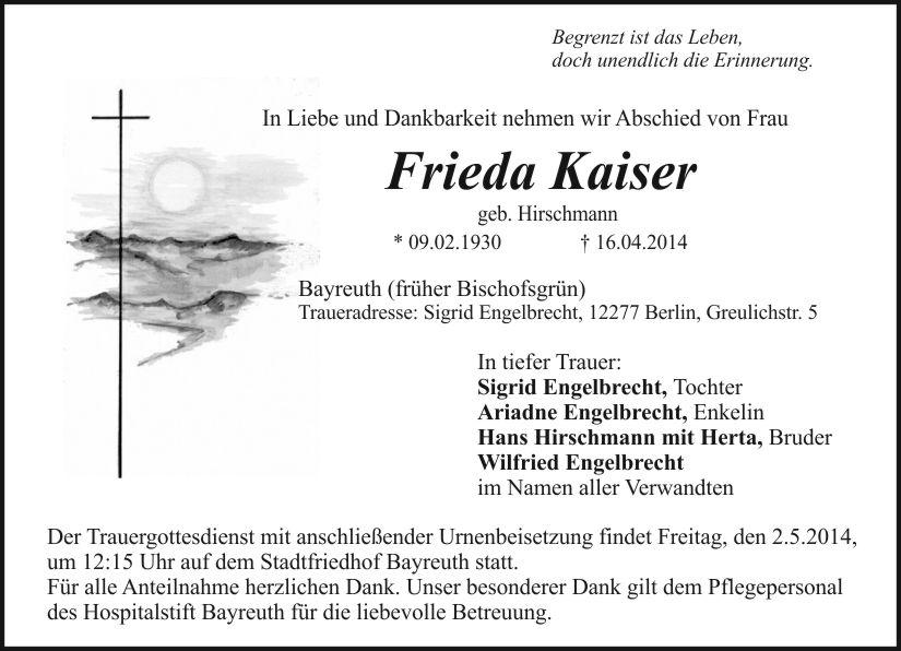 Der Trauergottesdienst mit anschließender Urnenbeisetzung findet Freitag, den 2.5.2014,