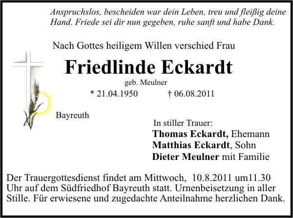 Die Beisetzung findet auf dem Friedhof in Friedhof Südfriedhof in Bayreuth statt.