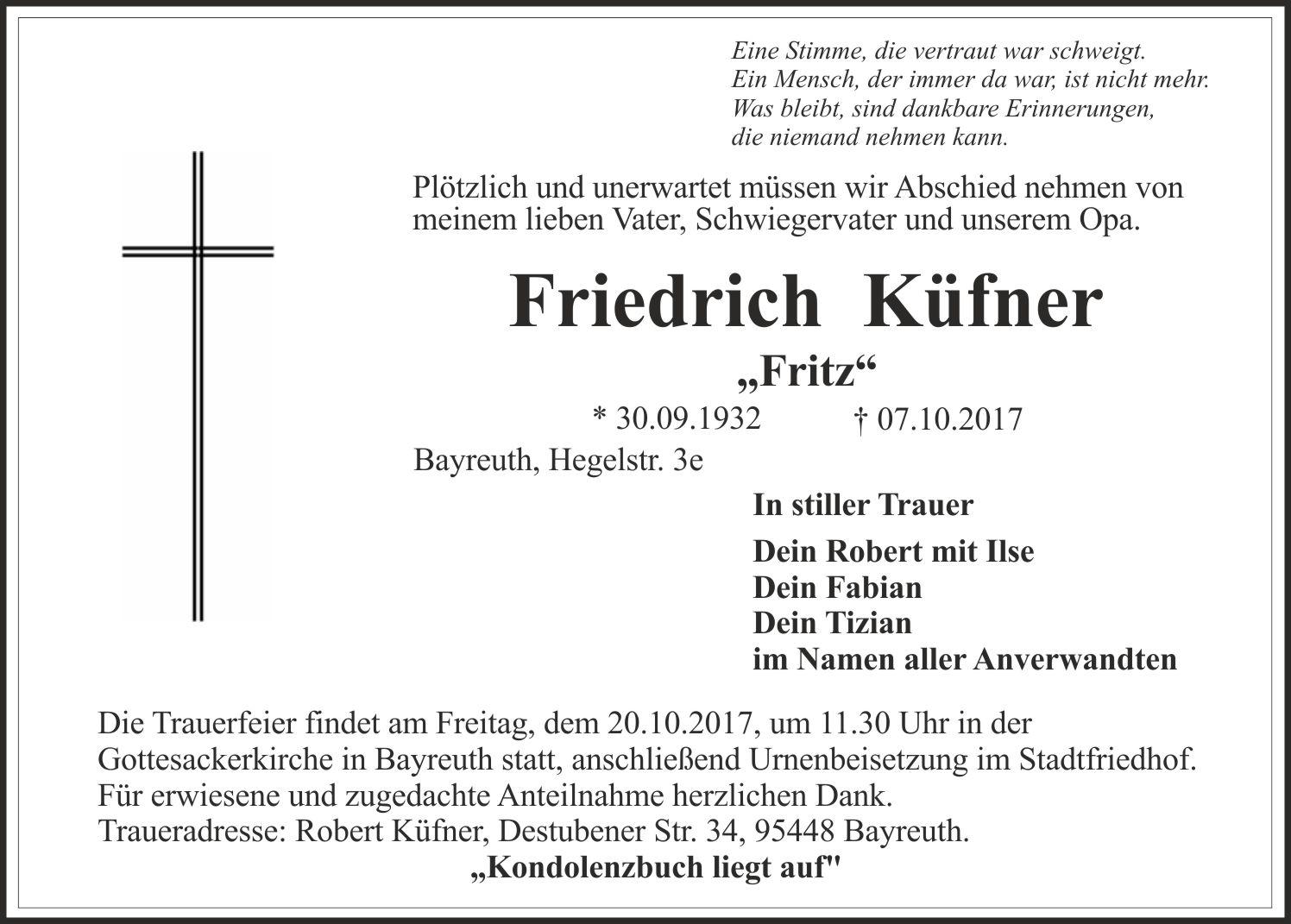 Traueradresse: Robert Küfner, Destubener Str. 34, 95448 Bayreuth.