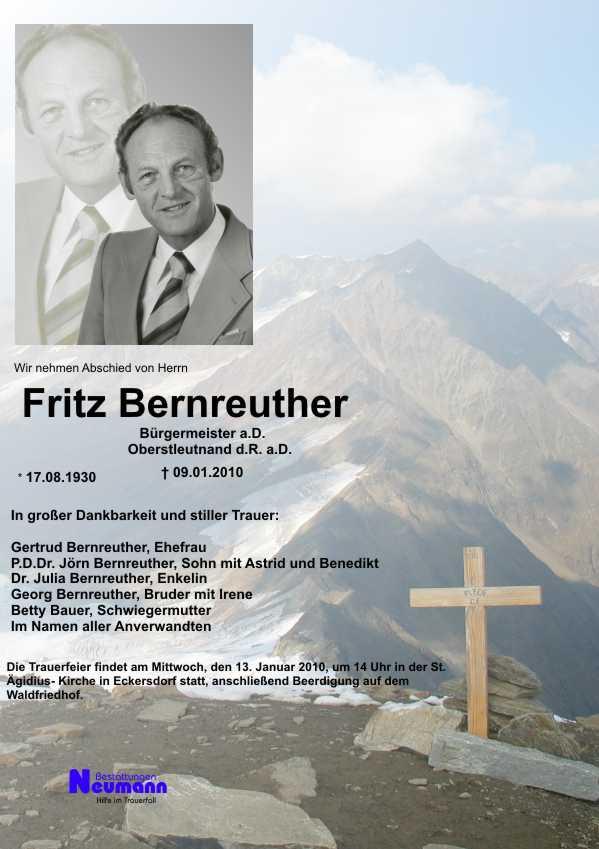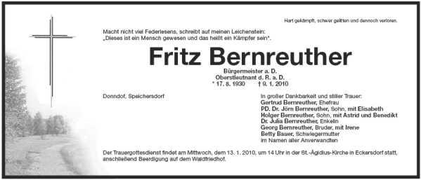 Der Trauergottesdienst findet am Mittwoch, dem 13.1.2010 um 14.00 Uhr in der St. Ägidius Kirche in Eckersdorf statt, anschließend Beerdigung auf dem Waldfriedhof.