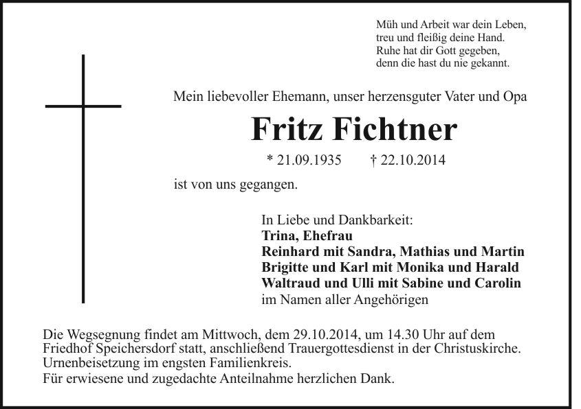 Wegsegnung am Mittwoch, den 29.10.2014, um 14.30 Uhr im Friedhof Speichersdorf, anschließend Trauergottesdienst in der Christuskirche. Urnenbeisetzung im engsten Familienkreis. Für alle Anteilnahme herzlichen Dank.