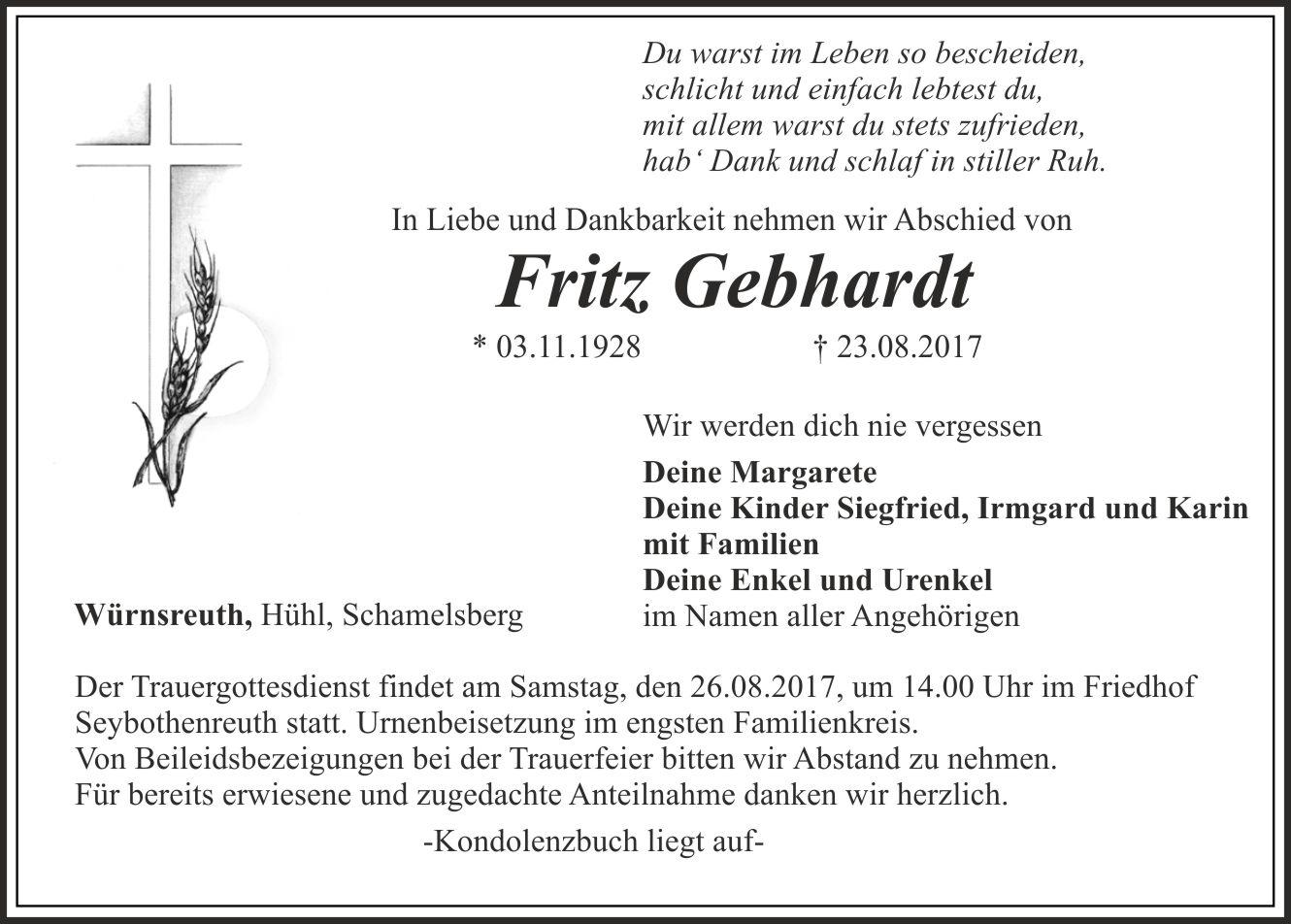 Der Trauergottesdienst findet am Samstag, den 26.08.2017, um 14.00 Uhr in Seybothenreuth statt, anschließend Wegsegnung. Urnenbeisetzung im engsten Familienkreis. Von Beileidsbezeigungen an der Trauerfeier bitten wir Abstand zu nehmen. Für alle Anteilnahme bedanken wir uns sehr herzlich.