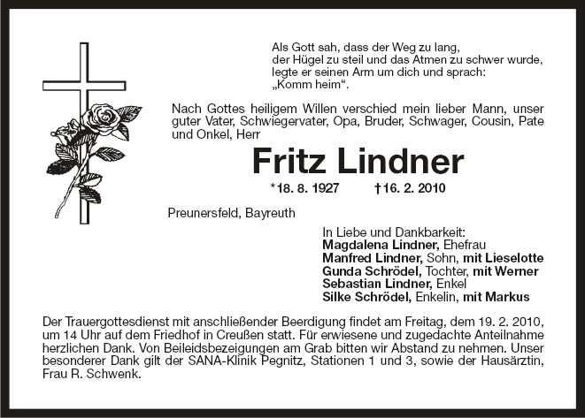 Die Beisetzung findet am Freitag, 19.02.2010 um 14:00 Uhr auf dem Friedhof in Creußen statt.