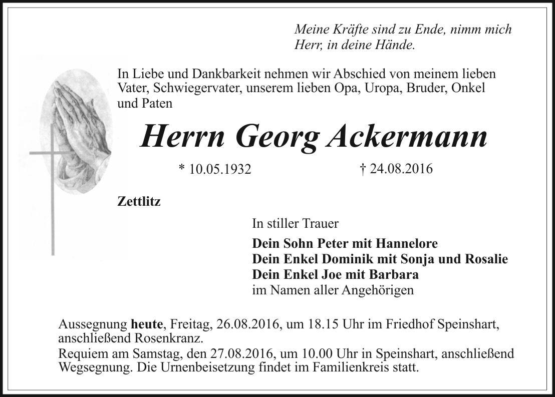 Aussegnung heute, Freitag, 26.08.2016, um 18.15 Uhr im Friedhof Speinshart, anschließend Rosenkranz.