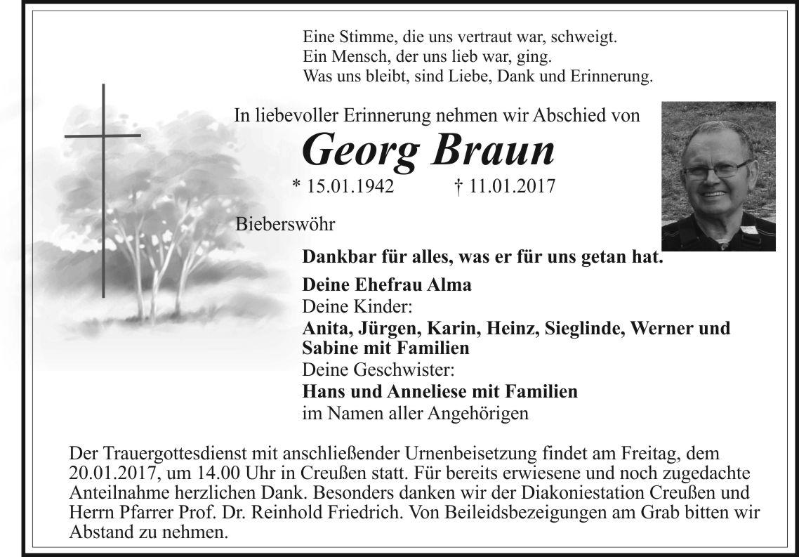 Der Trauergottesdienst mit anschließender Urnenbeisetzung findet am Freitag, dem 20.01.2017, um 14.00 Uhr in Creußen statt. Für bereits erwiesene und noch zugedachte Anteilnahme herzlichen Dank. Besonders danken wir der Diakoniestation Creußen und Herrn Pfarrer Prof. Dr. Reinhold Friedrich. Von Beileidsbezeigungen am Grab bitten wir Abstand zu nehmen.
