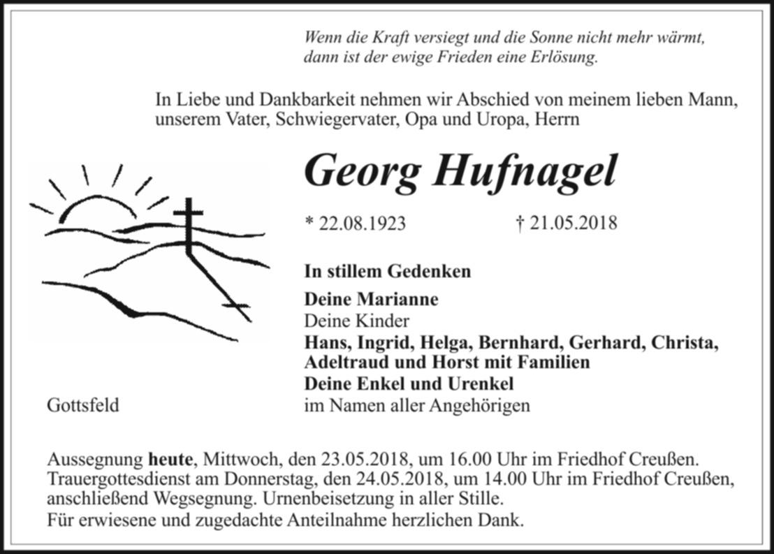 Aussegnung heute, Mittwoch, den 23.05.2018, um 16.00 Uhr im Friedhof Creußen. Trauergottesdienst am Donnerstag, den 24.05.2018, um 14.00 Uhr im Friedhof Creußen, anschließend Wegsegnung. Urnenbeisetzung in aller Stille.