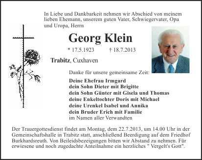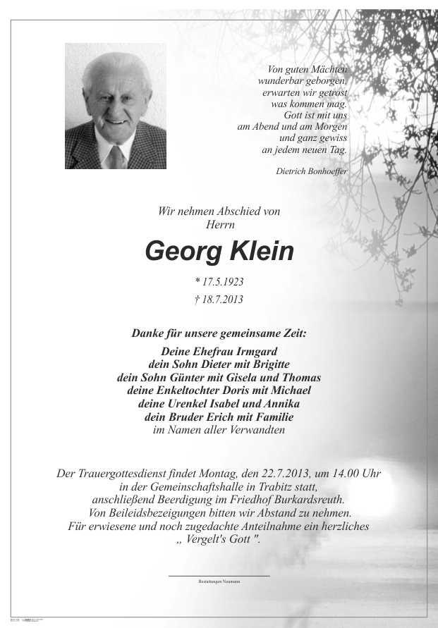 Der Trauergottesdienst findet am Montag, dem 22.7.2013, um 14.00 Uhr in der Gemeinschaftshalle in Trabitz statt, anschließend Beerdigung auf dem Friedhof Burkhardsreuth. Von Beileidsbezeigungen bitten wir Abstand zu nehmen. Für erwiesene und noch zugedachte Anteilnahme ein herzliches " Vergelt's Gott".