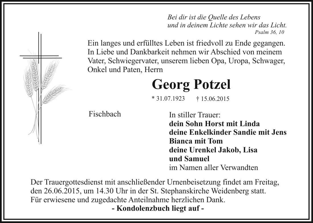 Die Trauerfeier mit anschließender Urnenbeisetzung findet am Freitag, den 26.06.2015 um 14.30 Uhr im Friedhof Weidenberg statt. Für alle Anteilnahme herzlichen Dank.