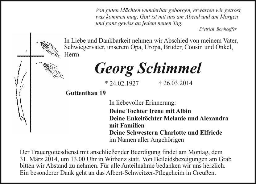 31. März 2014, um 13.00 Uhr in Wirbenz statt. Von Beileidsbezeigungen am Grab bitten wir Abstand zu nehmen. Für alle Anteilnahme bedanken wir uns herzlich.