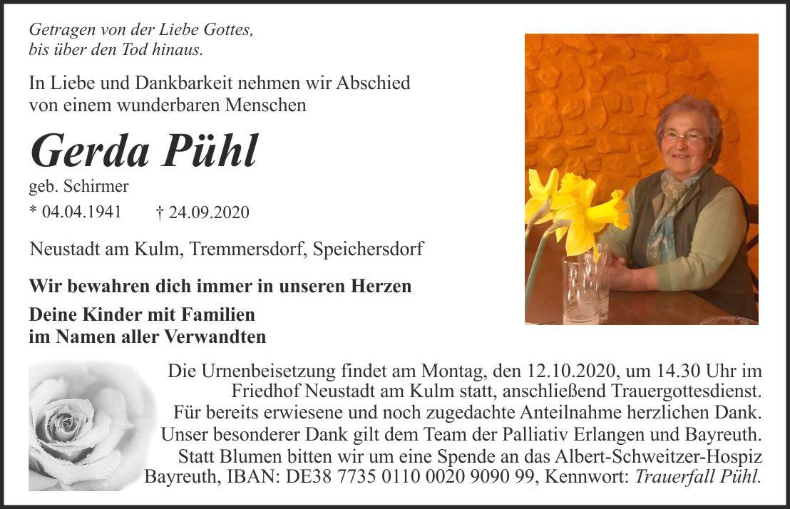 Statt Blumen bitten wir um eine Spende an das Albert-Schweitzer-Hospiz Bayreuth, IBAN: DE38 7735 0110 0020 9090 99, Kennwort: Trauerfall Pühl.