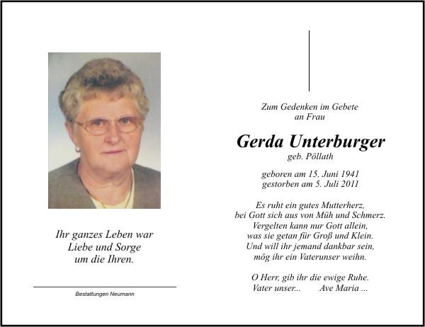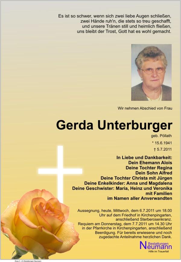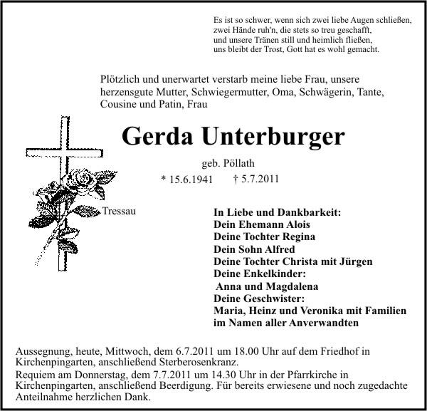 Mein tiefstes Beileid gilt den Angehörigen und vertrauten Menschen um Frau Gerda Unterburger in ihrer Trauer!