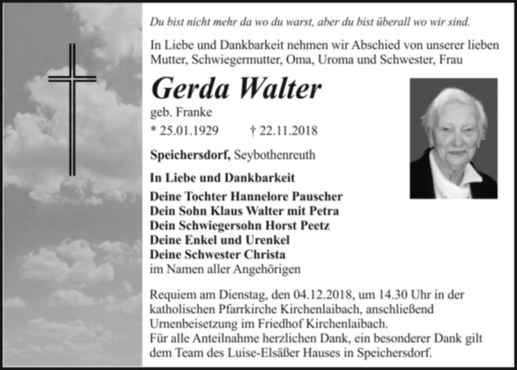 Requiem am Dienstag, den 04.12.2018, um 14.30 Uhr in der katholischen Pfarrkirche Kirchenlaibach, anschließend Urnenbeisetzung im Friedhof Kirchenlaibach.