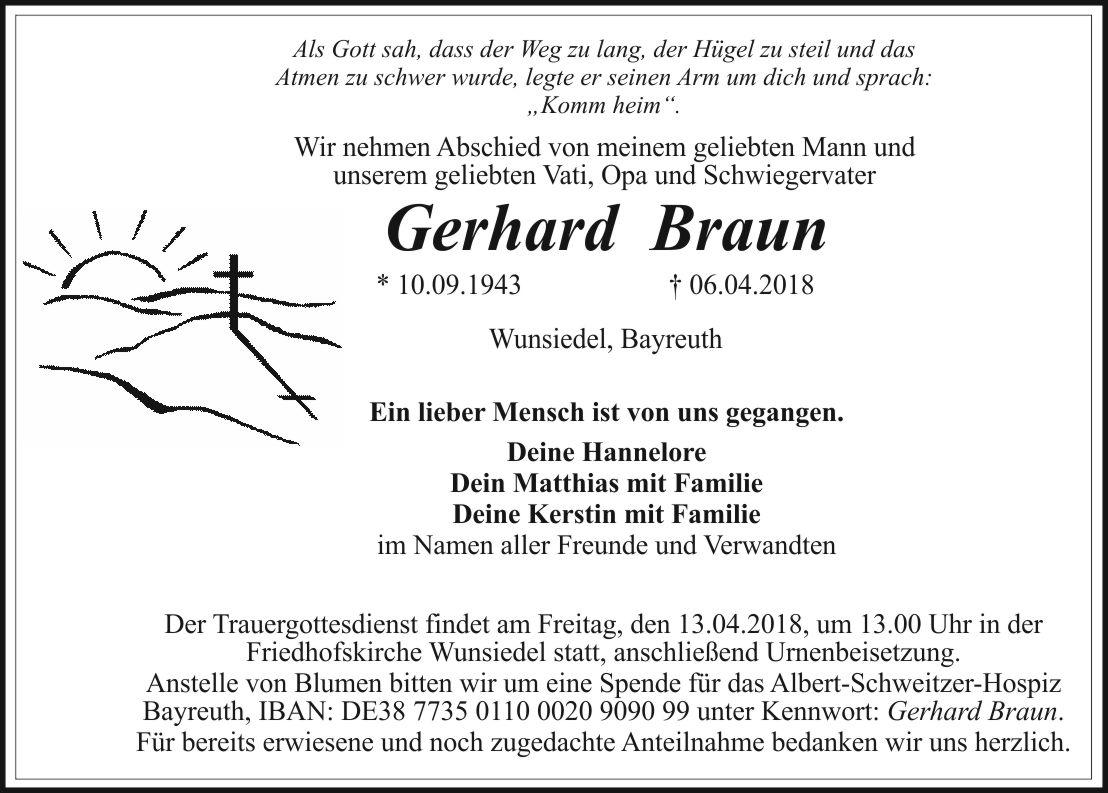 Anstelle von Blumen bitten wir um eine Spende für das Albert-Schweitzer-Hospiz Bayreuth, IBAN: DE38 7735 0110 0020 9090 99 unter Kennwort: Gerhard Braun.
