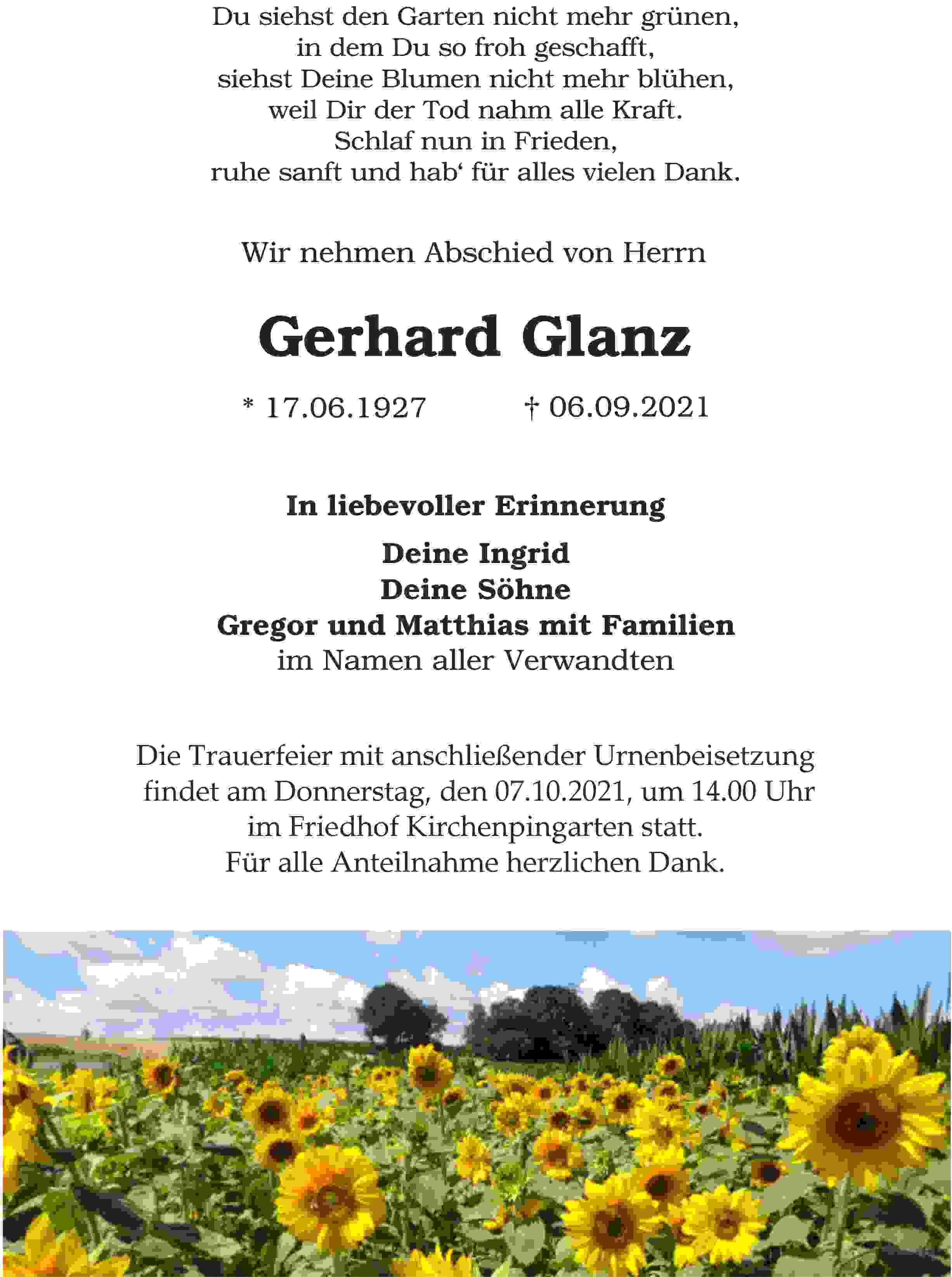 Die Trauerfeier findet am Donnerstag, den 07.10.2021, um 14.00 Uhr im Friedhof Kirchenpingarten statt, anschließend Urnenbeisetzung. Für alle Anteilnahme herzlichen Dank.