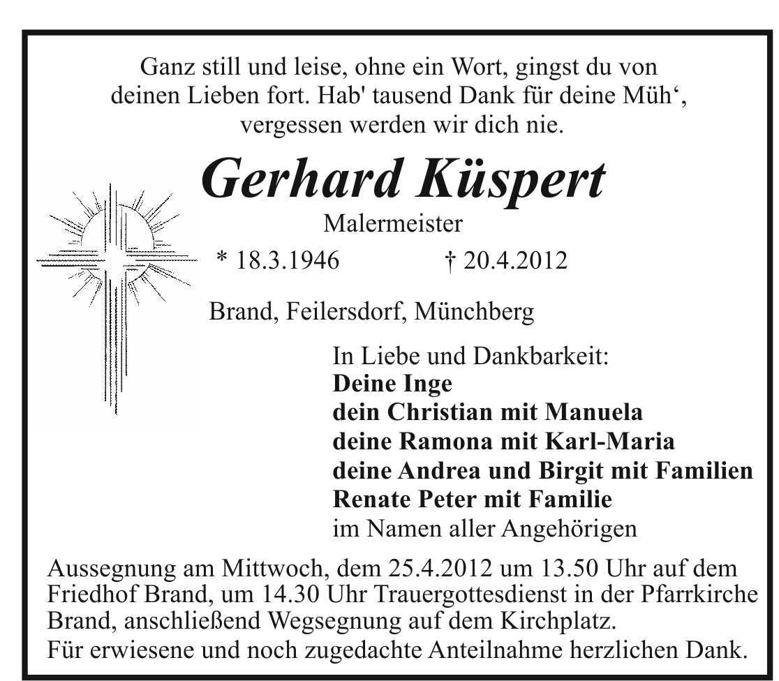 Aussegnung am Mittwoch, dem 25.4.2012 um 13.50 Uhr auf dem Friedhof Brand, um 14.30 Uhr Trauergottesdienst in der Pfarrkirche Brand, anschließend Wegsegnung auf dem Kirchplatz.