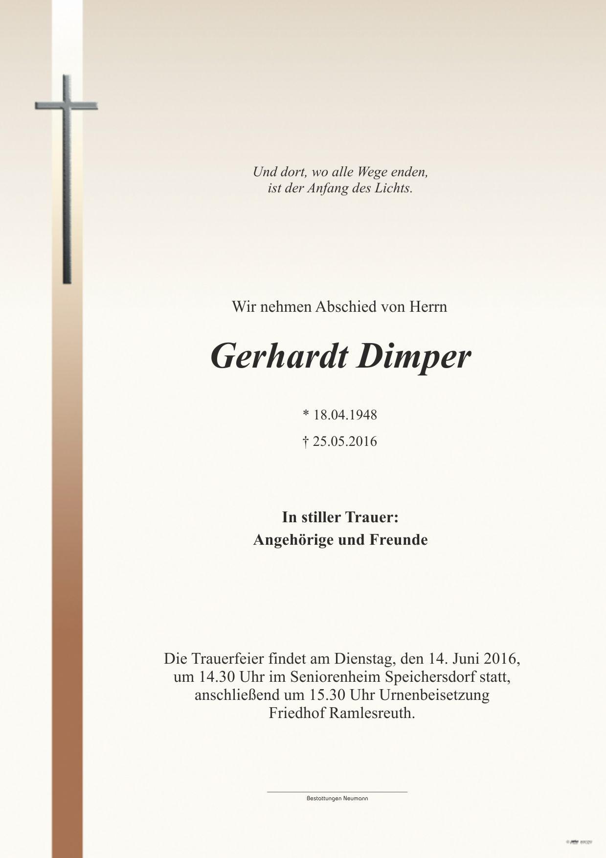 Die Trauerfeier findet am Dienstag, den 14.6.2016, um 14.30 Uhr im Seniorenheim Speichersdorf statt. Urnenbeisetzung anschließend um 15.30 Uhr im Friedhof Ramlesreuth.