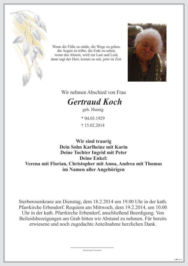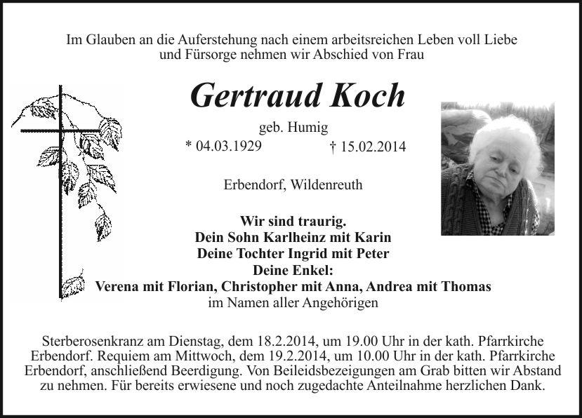 Sterberosenkranz am Dienstag, dem 18.2.2014, um 19.00 Uhr in der kath. Pfarrkirche Erbendorf. Requiem am Mittwoch, dem 19.2.2014, um 10.00 Uhr in der kath. Pfarrkirche Erbendorf, anschließend Beerdigung. Von Beileidsbezeigungen am Grab bitten wir Abstand zu nehmen. Für bereits erwiesene und noch zugedachte Anteilnahme herzlichen Dank.