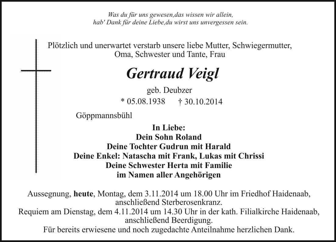 Requiem am Dienstag, dem 4.11.2014 um 14.30 Uhr in der kath. Filialkirche Haidenaab, anschließend Beerdigung.