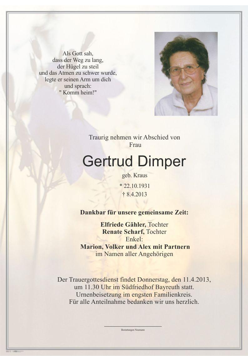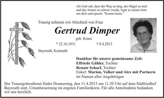 Der Trauergottesdienst findet Donnerstag, den 11.4.2013 um 11.30 Uhr auf dem Südfriedhof Bayreuth statt, Urnenbeisetzung im engsten Familienkreis. Für alle Anteilnahme bedanken wir uns herzlich.