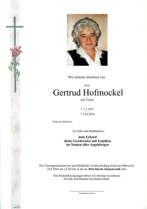 Der Trauergottesdienst mit anschließender Verabschiedung findet am Mittwoch, 18.8.2010 um 14.30 Uhr in der ev. Pfarrkirche Immenreuth statt. Die Urnenbeisetzung findet in aller Stille statt.