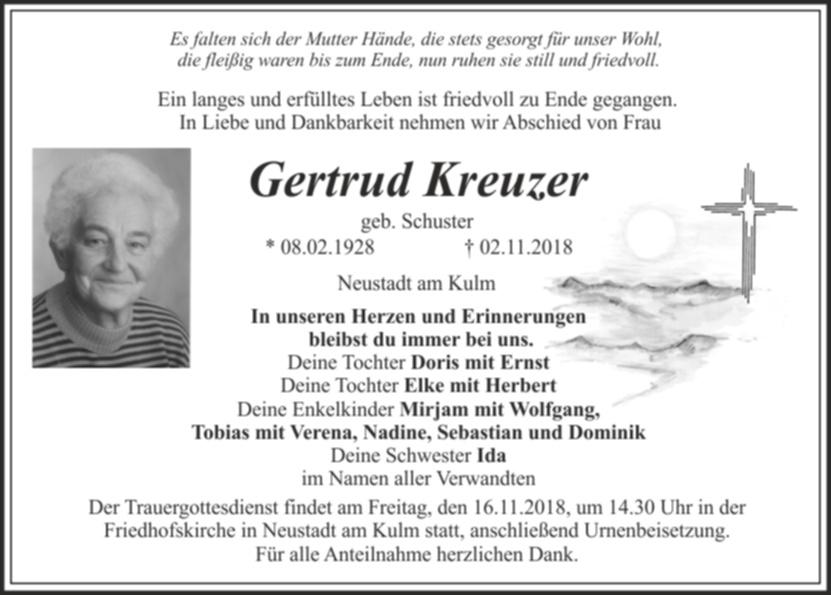 Der Trauergottesdienst findet am Freitag, den 16.11.2018 um 14.30 Uhr in der Friedhofskirche in Neustadt am Kulm statt, anschließend Urnenbeisetzung.