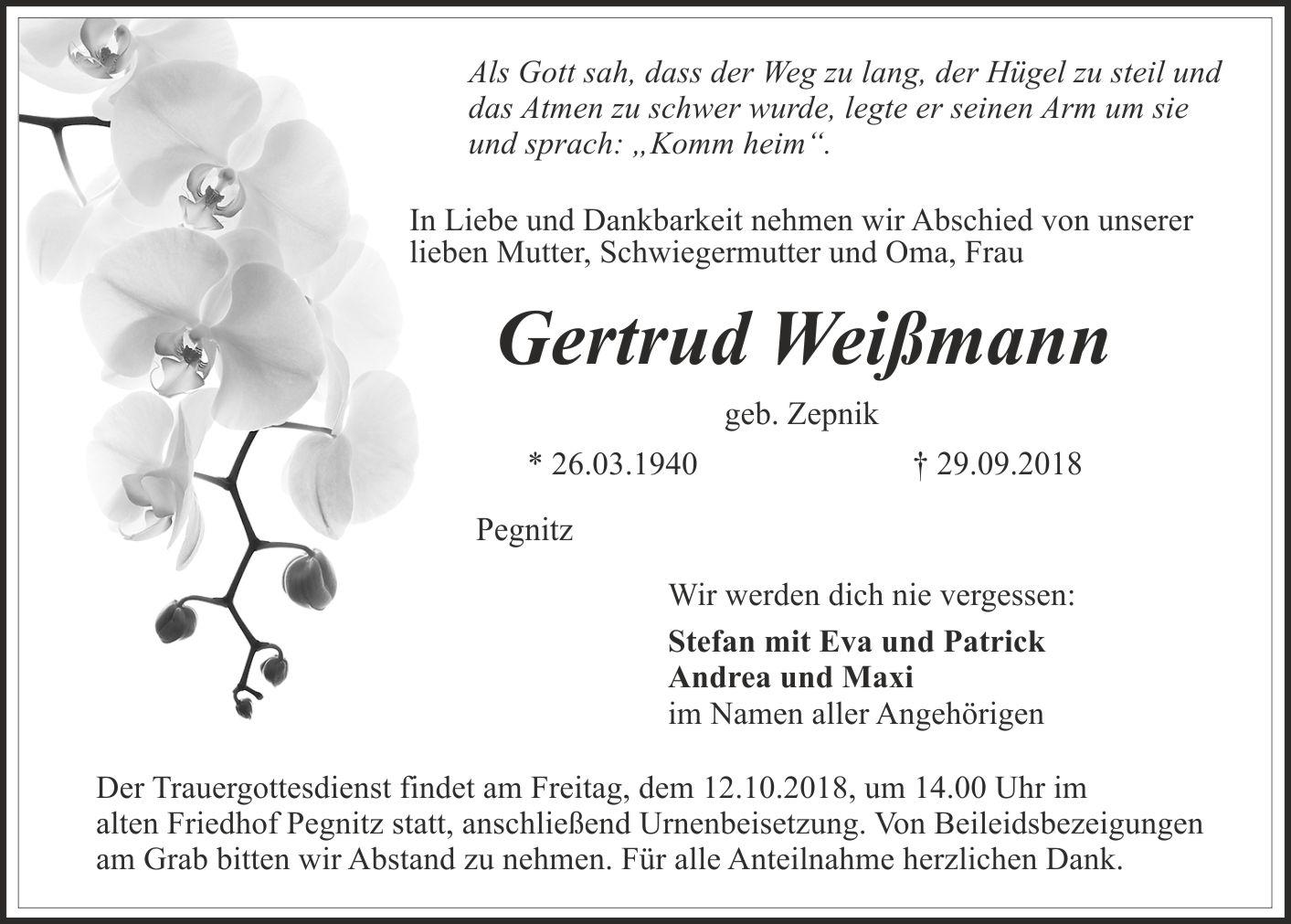 Der Trauergottesdienst mit anschließender Urnenbeisetzung findet am Freitag, dem 12.10.2018, um 14.00 Uhr im alten Friedhof Pegnitz statt. Für alle Anteilnahme herzlichen Dank.