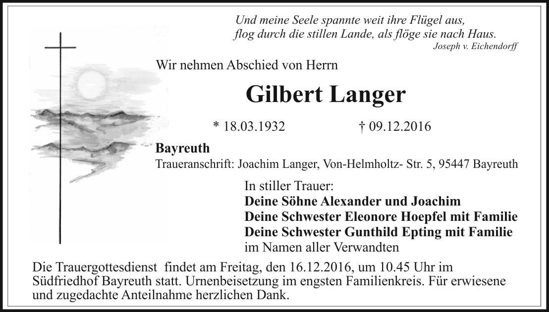 Die Trauergottesdienst findet am Freitag, den 16.12.2016, um 10.45 Uhr im Südfriedhof Bayreuth statt. Urnenbeisetzung im engsten Familienkreis. Für erwiesene und zugedachte Anteilnahme herzlichen Dank.