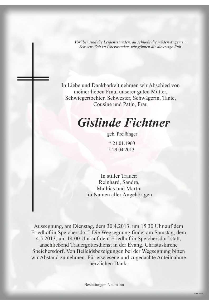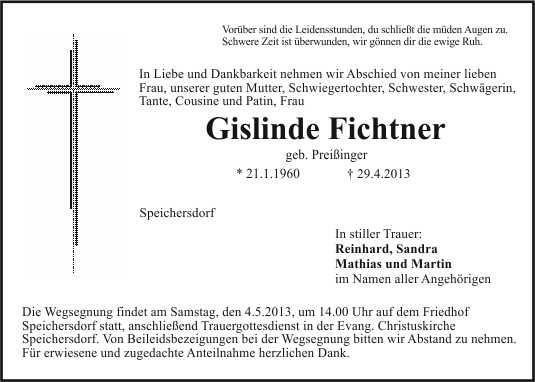 Die Wegsegnung findet am Samstag, den 4.5.2013, um 14.00 Uhr auf dem Friedhof Speichersdorf statt, anschließend Trauergottesdienst in der Evang. Christuskirche Speichersdorf. Von Beileidsbezeigungen bei der Wegsegnung bitten wir Abstand zu nehmen. Für erwiesene und zugedachte Anteilnahme herzlichen Dank.