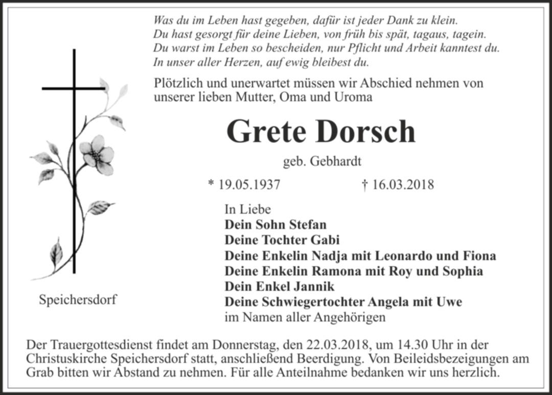Der Trauergottesdienst findet am Donnerstag, den 22.03.2018, um 14.30 Uhr in der Christuskirche Speichersdorf statt, anschließend Beerdigung. Von Beileidsbezeigungen am Grab bitten wir Abstand zu nehmen. Für alle Anteilnahme bedanken wir uns herzlich.