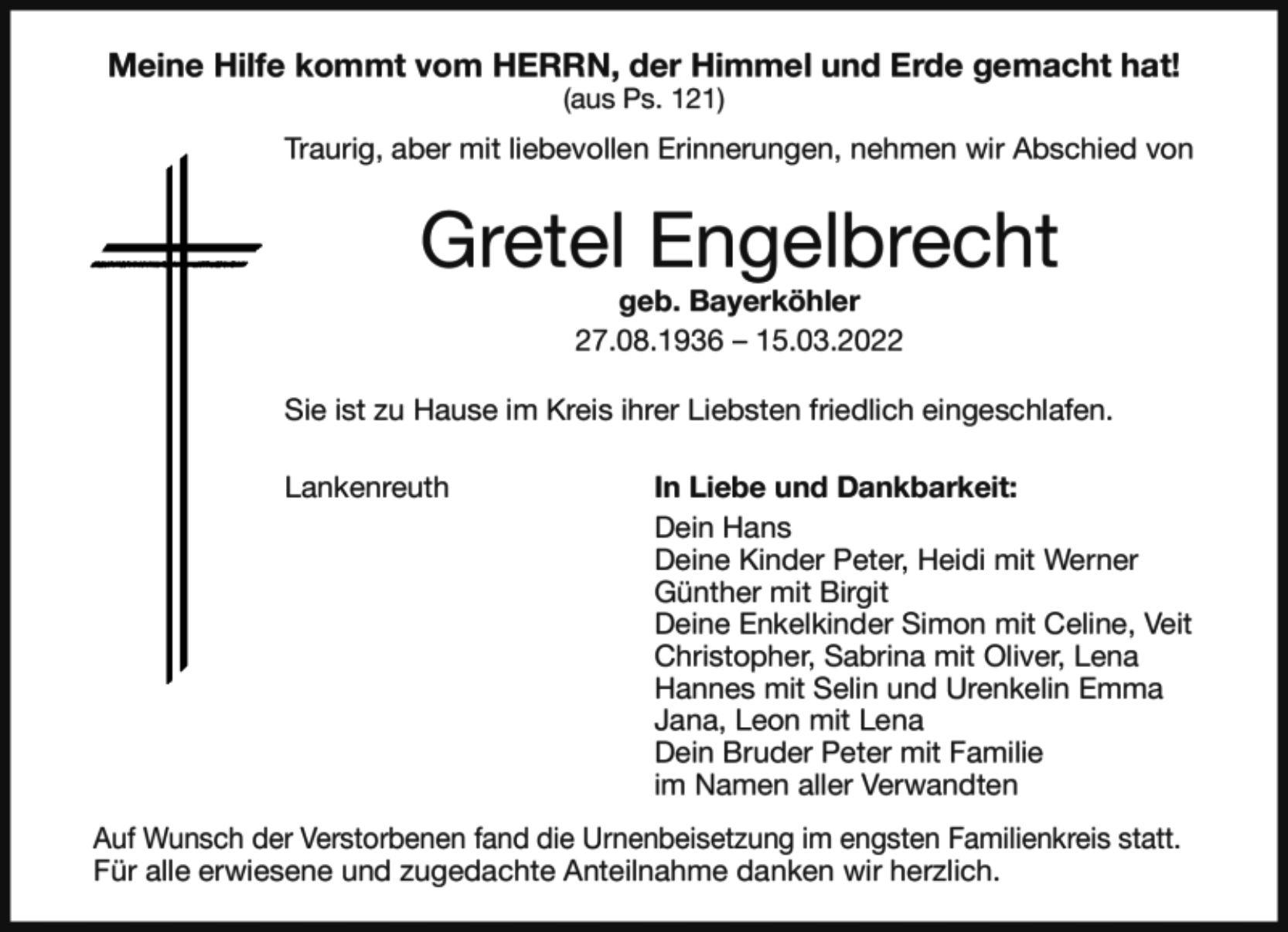 Auf Wunsch dere Verstorbenen fand die Beisetzung im engsten Familienkreis statt. Für alle Anteilnahme danken wir herzlich.