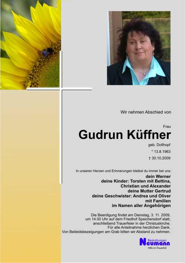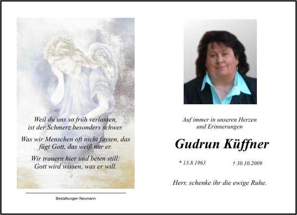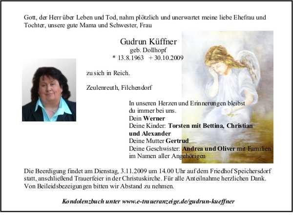 Tief erschüttert und betroffen waren wir, als uns die Nachricht vom Tod von Gudrun erreichte. Wir wünschen Euch viel Kraft und Glauben an die Zukunft, um diesen Verlust zu ertragen und nicht zu verbittern. Lasst Trauer zu und versäumt nicht, die Trauer aufzuarbeiten durch viele gemeinsame Gespräche.