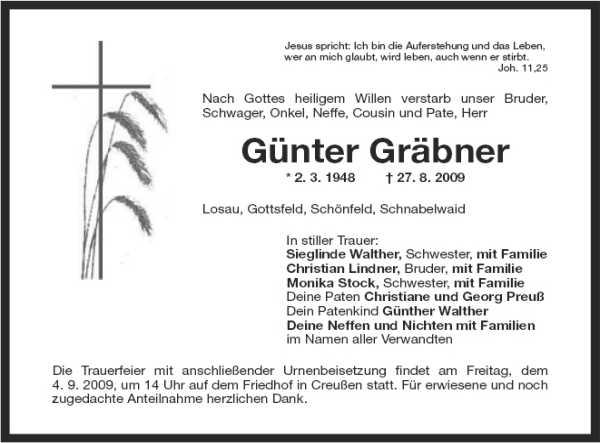 Die Beisetzung findet am Freitag, 04.09.2009 um 14:00 Uhr auf dem Friedhof in Creußen statt.