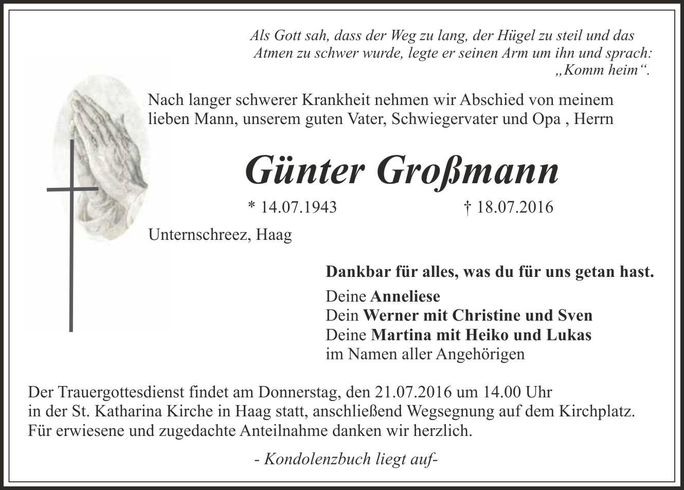 Der Trauergottesdienst findet am Donnerstag, den 21.07.2016, um 14.00 Uhr in der St. Katharina Kirche in Haag statt, anschließend Wegsegnung auf dem Kirchplatz. Für alle Anteilnahme herzlichen Dank.