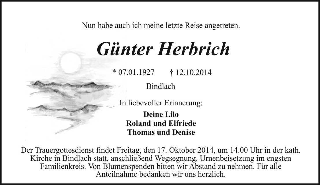 Der Trauergottesdienst findet Freitag, den 17. Oktober 2014, um 14.00 Uhr in der kath. Kirche in Bindlach statt, anschließend Wegsegnung. Urnenbeisetzung im engsten Familienkreis. Von Blumenspenden bitten wir Abstand zu nehmen. Für alle Anteilnahme bedanken wir uns herzlich.