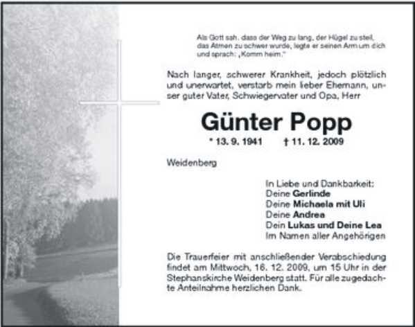 Die Trauerfeier mit anschließender Verabschiedung findet am Mittwoch, 16.12.2009 um 15.00 Uhr in der Stephanskirche Weidenberg statt.