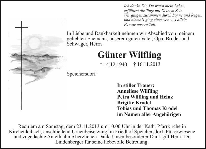 Requiem am Samstag, dem 23.11.2013 um 10.00 Uhr in der Kath. Pfarrkirche in Kirchenlaibach, anschließend Urnenbeisetzung im Friedhof Speichersdorf. Für erwiesene und zugedachte Anteilnahme herzlichen Dank. Unser besonderer Dank gilt Herrn Dr. Lindenberger für seine liebevolle Betreuung.