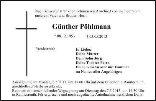 Aussegnung am Montag, 6.5.2013, um 17.00 Uhr auf dem Friedhof in Ramlesreuth, anschließend Sterberosenkranz.