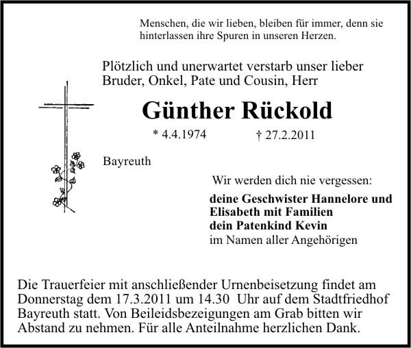 Der Trauergottesdienst mit anschließender Urnenbeisetzung findet am Donnerstag, den 17.3.2011 um 14.30 Uhr auf dem Stadtfriedhof Bayreuth statt.