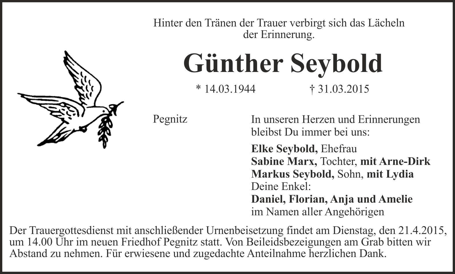 Der Trauergottesdienst mit anschließender Urnenbeisetzung findet am Dienstag, den 21.4.2015, um 14.00 Uhr im neuen Friedhof Pegnitz statt. Für alle Anteilnahme herzlichen Dank.