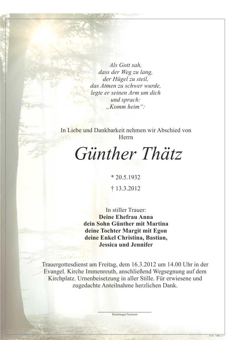 Der Trauergottesdienst findet am Freitag, dem 16.3.2012 um 14.00 Uhr in der evang. Kirche Immenreuth statt, anschließend Wegsegnung auf dem Kirchplatz. Urnenbeisetzung in aller Stille. Für erwiesene und zugedachte Anteilnahme herzlichen Dank.